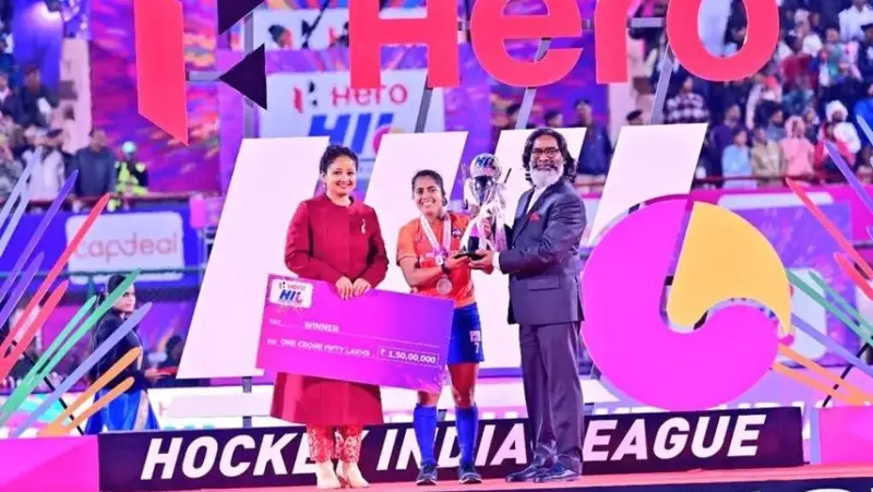 मुख्यमंत्री हेमन्त सोरेन ने महिला हॉकी इंडिया लीग (एचआइएल) फाइनल मैच की विजेता टीम ओडिशा वॉरियर्स को पुरस्कार राशि का चेक, मेडल एवं ट्रॉफी प्रदान किया