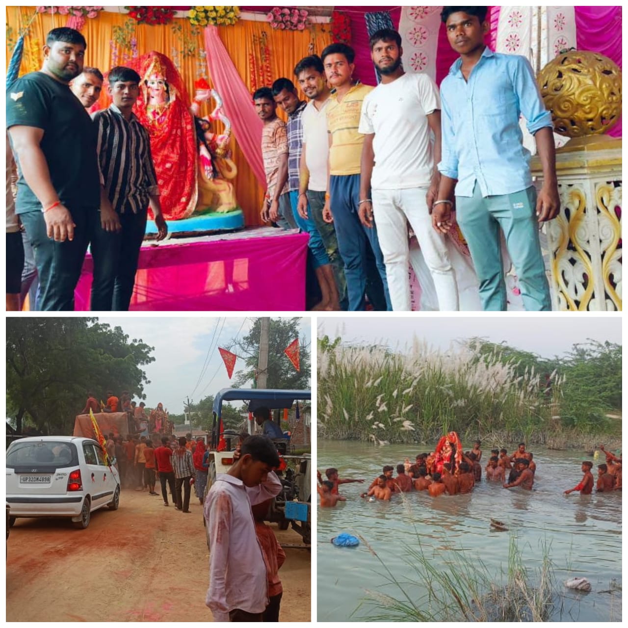 खीरो, रायबरेली। नवरात्रि महापर्व के समापन के बाद शनिवार देर शाम खीरो ब्लॉक के विभिन्न गांवों के पांडल्लो में स्थापित मां दुर्गा की प्रतिमाओं की शोभायात्रा के साथ नहर या गंगा तट पर भूमि गत विसर्जन किया गया। भक्तों ने नाचते-गाते हुए मां दुर्गा को अंतिम विदाई दी और आरती उतारकर विसर्जन किया।