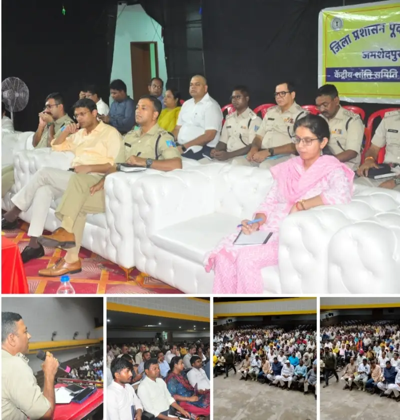 जमशेदपुर (झारखंड)। सिदगोड़ा स्थित बिरसा मुंडा टाउन हॉल में जिला दण्डाधिकारी-सह- उपायुक्त श्री अनन्य मित्तल एवं वरीय पुलिस अधीक्षक श्री किशोर कौशल द्वारा शांतिपूर्ण एवं सौहार्द्रपूर्ण वातावरण में दुर्गापूजा के आयोजन को लेकर केन्द्रीय शांति समिति के साथ बैठक की गई। बैठक में विधि व्यवस्था, यातायात व्यवस्था, भीड़ को व्यवस्थित करने, सुरक्षा संबंधी अन्य महत्वपूर्ण बिदुओं पर चर्चा की गई ।