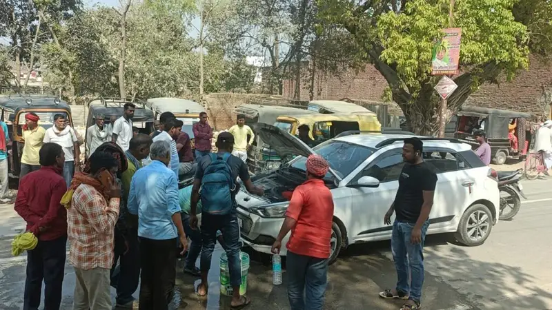 • चहनियां कस्बा में आग लगी गाड़ी में आग बुझाते ग्रामीण