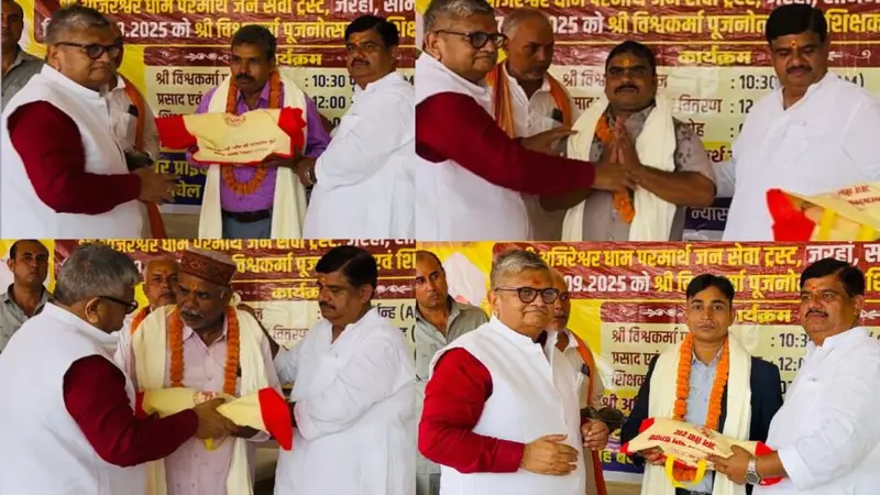 सोनभद्र। श्री श्री विश्वकर्मा पूजनोत्सव एवं शिक्षक सम्मान समारोह का आयोजन अजिरेश्वर धाम परमार्थ जन सेवा ट्रस्ट द्वारा जरहाँ (सोनभद्र) में बड़े ही धूमधाम से सम्पन्न हुआ। इस अवसर पर शिक्षा के क्षेत्र में योगदान देने वाले कुल 101 शिक्षक-शिक्षिकाओं को सम्मानित किया गया। कार्यक्रम के मुख्य संरक्षक राजेन्द्र सिंह बघेल (अध्यक्ष एवं न्यासकर्ता श्री अजीरेश्वर धाम परमार्थ जन सेवा ट्रस्ट एवं मे0 बघेल इंफ्रास्ट्रक्चर प्रा. लि.) की पहल पर इस भव्य समारोह का आयोजन किया गया।