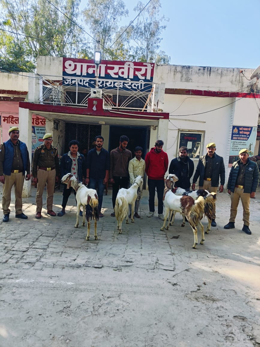 रायबरेली। खीरो पुलिस ने एक बकरा चोर गैंग का पर्दाफाश किया है। जिसमें 6 शातिर अभियुक्तों को चार बकरा के साथ गिरफ्तार किया है। यह सभी शातिर चोर बिंदाखेड़ा और देवपुर के बीच के जंगलों से गिरफ्तारी बताई जा रही है। फिरहाल पुलिस ने अभियुक्तों पर मुकदमा दर्जकर जेल भेज दिया है।