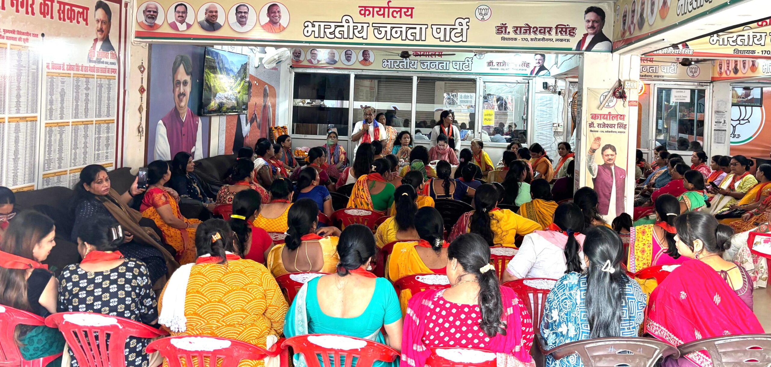 लखनऊ। प्रधानमंत्री नरेंद्र मोदी के जन्मदिवस पर शुरू हुए “सेवा पखवाड़ा” के तहत सरोजनीनगर विधायक डॉ. राजेश्वर सिंह के आशियाना स्थित कार्यालय में मंगलवार को महिला चौपाल का आयोजन किया गया। कार्यक्रम में बड़ी संख्या में महिलाएँ शामिल हुईं और “नारी शक्ति बनेगी विकसित भारत की धुरी” का संकल्प दोहराया।
