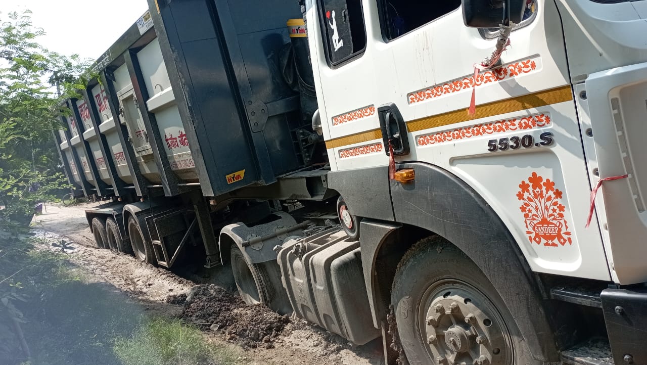 मुरैनी नहर पुल–डेपारमऊ मार्ग पर धंसी सड़क में मौरंग से लदा डंपर फंसा, घंटों जाम