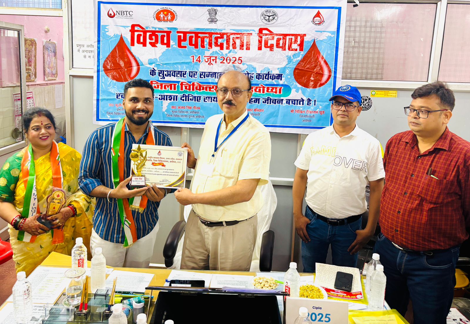 अयोध्या: विश्व रक्तदाता दिवस के अवसर पर जिला चिकित्सालय अयोध्या में आयोजित सम्मान समारोह में “दि आयुष्मान फाउंडेशन” के सामाजिक कार्यों को मान्यता देते हुए फाउंडेशन के संस्थापक पवन पटेल को प्रशस्ति पत्र और स्मृति चिन्ह देकर सम्मानित किया गया।इस अवसर पर मुख्य चिकित्सा अधीक्षक डॉ. अजय सिंह गौतम ने फाउंडेशन द्वारा समय-समय पर किए गए रक्तदान शिविरों और जनजागरूकता अभियानों की सराहना करते हुए कहा कि ऐसे युवा संगठनों की सहभागिता स्वास्थ्य सेवाओं को और सशक्त बनाती है ! कार्यक्रम में अन्य गणमान्य अतिथियों की उपस्थिति में समाजसेवी पवन पटेल ने कहा कि “रक्तदान एक महान सेवा है और ‘दि आयुष्मान फाउंडेशन’ आगे भी इसी तरह मानव सेवा के कार्य करता रहेगा।” ! यह सम्मान संस्था के सहयोग से होने वाले रक्तदान शिविरों में रक्तदान करने वाले सभी रक्तदाताओं को समर्पित करता हूँ ! कार्यक्रम का आयोजन राष्ट्रीय स्वास्थ्य मिशन, उत्तर प्रदेश एवं राज्य रक्त संक्रमण परिषद (SBTC) के संयुक्त तत्वावधान में जिला चिकित्सालय अयोध्या पर किया गया